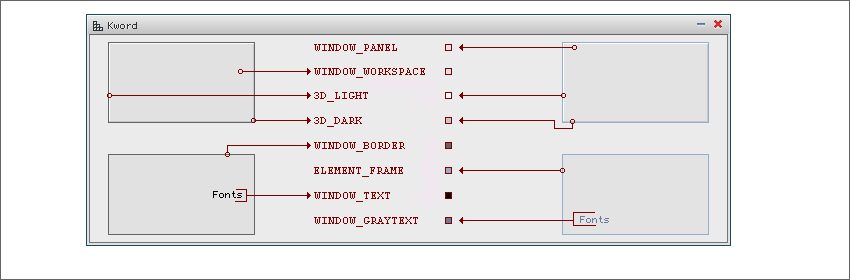 Panel - цвета для панелей расположения элементов. ![]() Panel может быть отрисована в различных градациях цветов. Это позволяет разделять области распо- ложения элементов управления. На панеле допускается отрисовывать несколько других панелей с различными элементами управления. Как объект интерфейса может отрисовываться как активным элементом, так и не ак- тивным (то есть не доступным для манипуляций). 1 WINDOW_PANEL - Фон панелей приложения. 2 WINDOW_WORKSPACE - Фон дочерних потоков и меню приложения (допускается). 3 WINDOW_BORDER - Цвет рамки панели (допускается). 4 3D_DARK - Цвет внутренней теневой обводки, для придания трехмерности. 5 3D_LIGHT - Цвет внутренней световой обводки, для придания трехмерности. 6 ELEMENT_FRAME - Цвет рамки панели. 7 WINDOW_TEXT - Цвет текста в рабочей области панели. 8 WINDOW_GRAYTEXT - Цвет неактивного текста. |