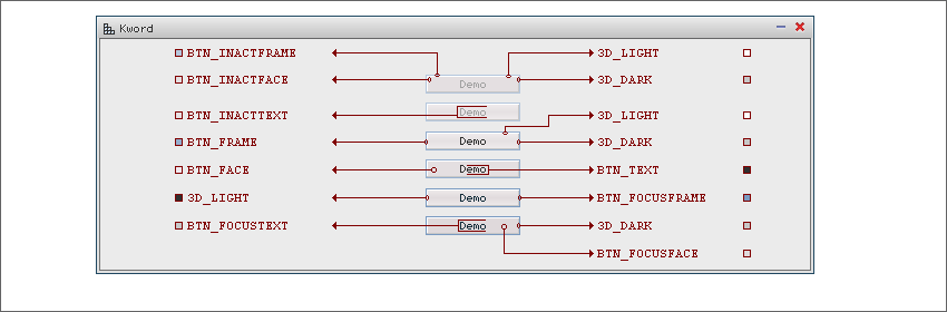 Button - цвета для кнопок. ![]() Button имеет два основных состояния (активное и неактивное) и одно вспомогательное (активное в фокусе курсора). Исполнение допускается как с использованием элементов придания трехмерности, так и без них. Допускается отрисовка как в виде прямоугольника, так и без крайних угловых пикселей. 1 BTN_INACTFACE - Фон неактивной кнопки. 2 BTN_INACTFRAME - Цвет рамки неактивной кнопки. 3 BTN_INACTTEXT - Цвет текста неактивной кнопки. 4 BTN_FACE - Фон активной кнопки. 5 BTN_FRAME - Цвет рамки кнопки. 6 BTN_TEXT - Цвет текста кнопки. 7 BTN_FOCUSFACE - Фон кнопки при наведении. 8 BTN_FOCUSFRAME - Цвет рамки кнопки при наведении. 9 BTN_FOCUSTEXT - Цвет текста кнопки при наведении. 10 3D_LIGHT - Световая обводка 3D. 11 3D_DARK - Теневая обводка 3D. |