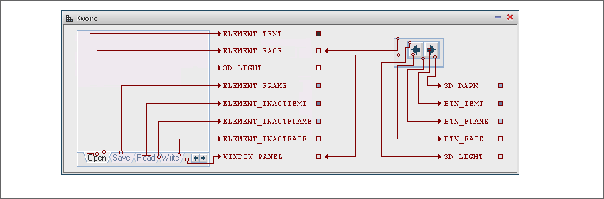 TabSet - цвета для элемента закладок. ![]() TabSet - панель вкладок. Изображение приведенное на рисунке - это один из возможных вариантов его отрисовки. Элемент не может иметь неактивного состояния, но может иметь неактивные (недоступные) вкла- дки. Текущая активная вкладка, отличается от других активных вкладок: либо отсутствием разделительной черты между заголовком и полем вкладки (как на рисунке), либо фон активной вкладки с выделением дол-. жен быть залит цветом ELEMENT_VOLUME (пример не приведен). 1 ELEMENT_FACE - Фон поля элемента и активных заголовков. 2 ELEMENT_INACTFACE - Фон неактивных (недоступных) заголовков. 3 ELEMENT_FRAME - Цвет рамки активных заголовков и поля элемента. 4 ELEMENT_INACTFRAME - Цвет рамки неактивных элементов. 5 ELEMENT_VOLUME - Цвет текущего активного элемента если нет разграничительной линии. 6 ELEMENT_TEXT - Цвет текста активных заголовков и поля. 7 ELEMENT_INACTTEXT - Цвет текста неактивныых заголовков. 8 BTN_FACE - Фон кнопок листинга. 9 BTN_FRAME - Цвет рамки кнопок. 10 BTN_TEXT - Цвет стрелок кнопок. 11 3D_LIGHT - Световая обводка 3D. 12 3D_DARK - Теневая обводка 3D. 13 WINDOW_PANEL - Фон панели заголовков (при наличии). |