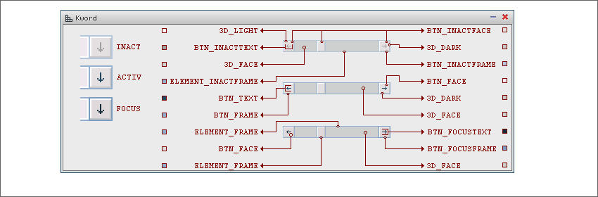 ScrollBar - цвета для полосы прокрутки. ![]() ScrollBar имеет два основных состояния (активное и неактивное) и одно вспомогательное (активное в фокусе курсора). Вспомогательное состояние (при наличии реализации) предполагает срабатывание только при наведении курсора непосредственно на ползунок или на кнопки, при чем реакция каждого происходит. индивидуально (т.е. при наведении на одну из кнопок скрола, фокус срабатывает только на неё). 1 BTN_FACE - Фон активного ползунка и кнопок. 2 BTN_FRAME - Цвет рамки активного ползунка и кнопок. 3 BTN_TEXT - Цвет стрелок на активных кнопках. 4 BTN_FOCUSFACE - Фон ползунка и кнопок при наведении. 5 BTN_FOCUSFRAME - Цвет рамки ползунка и кнопок при наведении. 6 BTN_FOCUSTEXT - Цвет стрелок кнопок при наведении. 7 BTN_INACTFACE - Фон неактивного ползунка и неактивных кнопок. 8 BTN_INACTFRAME - Цвет рамки неактивного ползунка и неактивных кнопок. 9 BTN_INACTTEXT - Цвет стрелок неактивных кнопок. 10 ELEMENT_FRAME - Цвет рамки скролла под ползунком и кнопками. 11 ELEMENT_INACTFRAME - Цвет рамки неактивного скролла под ползунком и кнопками. 12 3D_LIGHT - Световая обводка 3D. 13 3D_DARK - Теневая обводка 3D. 14 3D_FACE - Фон скролла под ползунком и кнопками. |