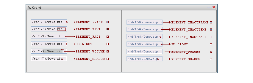 Edit - цвета для отрисовки однострочного элемента ввода текста. ![]() Edit имеет 2 состояния: активное и неактивное. Даже если окно неактивно, сам компонент отрисо- вывается как активный. Цвета для отрисовки Edit с которым не возможно производить какие либо события, отрисовывается цветами с приставкой ELEMENT_INACT. 1 ELEMENT_FACE - Фон активного Edit элемента. 2 ELEMENT_INACTFACE - Фон неактивного Edit элемента. 3 ELEMENT_FRAME - Цвет внешней рамки активного Edit элемента. 4 ELEMENT_INACTFRAME - Цвет внешней рамки неактивного Edit элемента. 5 ELEMENT_VOLUME - Цвет выделения текста. 6 ELEMENT_TEXT - Цвет текста активного Edit элемента. 7 ELEMENT_INACTTEXT - Цвет текста неактивного Edit элемента. 8 ELEMENT_SHADOW - Цвет тени от текста у Edit элемента. 9 3D_LIGHT - Цвет внутренней световой обводки, для придания трехмерности. ПРИМЕЧАНИЯ: ELEMENT_VOLUME - применение этого цвета для неактивного Edit недопустимо, так как выделение текста является событием. ELEMENT_SHADOW - этот цвет допускается использовать как для активного Edit, так и для неактивного. ГРАДИЕНТНАЯ ЗАЛИВКА - Для отрисовки градиентного фона элемента Edit, необходимо использовать цвет ELEMENT_FACE, как среднее для крайных значений градиента. Рекомендуется применять отклонения ± 10h на 20 пикселей элемента по высоте, для каждой из составляющих RGBA. (Или ± 10h для всех элементов незави- симо от высоты, для каждой из составляющих RGBA). |