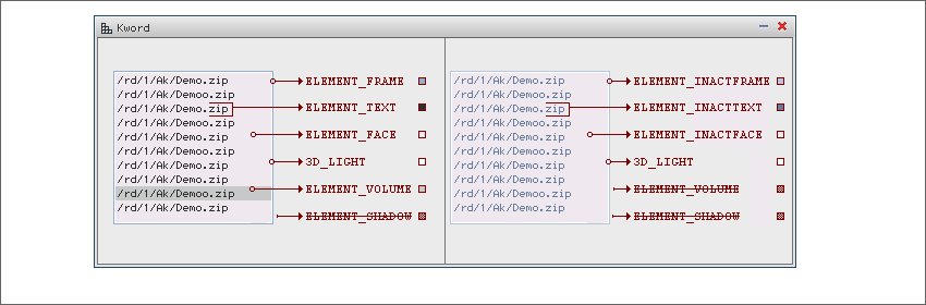 Listbox - цвета для отрисовки многострочного списка выбора элементов. ![]() Listbox имеет 2 состояния: активное и неактивное. Даже если окно неактивно, сам компонент отрисо- вывается как активный. Цвета для отрисовки Listbox с которым не возможно производить какие либо события, отрисовывается цветами с приставкой ELEMENT_INACT. 1 ELEMENT_FACE - Фон активного Listbox элемента. 2 ELEMENT_INACTFACE - Фон неактивного Listbox элемента. 3 ELEMENT_FRAME - Цвет внешней рамки активного Listbox элемента. 4 ELEMENT_INACTFRAME - Цвет внешней рамки неактивного Listbox элемента. 5 ELEMENT_VOLUME - Цвет выделения элемента из списка. 6 ELEMENT_TEXT - Цвет текста активного Listbox элемента. 7 ELEMENT_INACTTEXT - Цвет текста неактивного Listbox элемента. 9 3D_LIGHT - Цвет внутренней световой обводки, для придания трехмерности. ПРИМЕЧАНИЯ: ELEMENT_VOLUME - применение этого цвета для неактивного Listbox недопустимо, так как выбор элемента является событием. ELEMENT_SHADOW - этот цвет недопускается (и нерекомендуется) использовать для Memo. ГРАДИЕНТНАЯ ЗАЛИВКА - недопускается (и нерекомендуется) использовать для Memo. 3D_LIGHT - можно как использовать, так и пренебрегать его применением. |